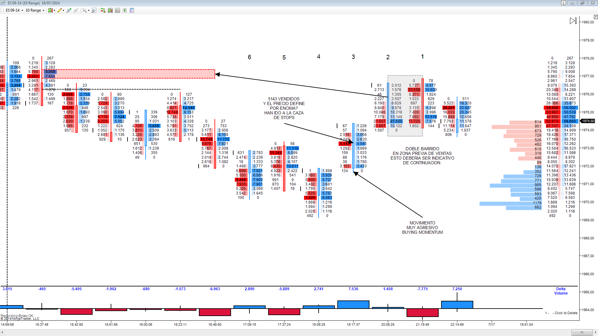 En la foto en cuestión (no la que esta adjunta por encima de estas lineas, sino la que esta en el post donde se planteo la cuestion) se ve las ordenes ejecutadas en el footprint chart y también las ordenes limitadas. Se ve claramente como el mercado esta ofertando (ordenes limitadas) dos tics por encima del precio de cotización actual 4075 contratos en oferta y 2685. Con el volumen de trabajo generado en la vela 2,es evidente que la zona de 74.5 puede ser clave en la continuación ,quizás soporte para pensar en largo. Si esa es la idea porque el mercado ofertando cerca de 6000 contratos? No se si se entiendo lo explicado, pero si los compradores quieren estar 3 tics por encima del precio actual deben absorber toda esa oferta.
