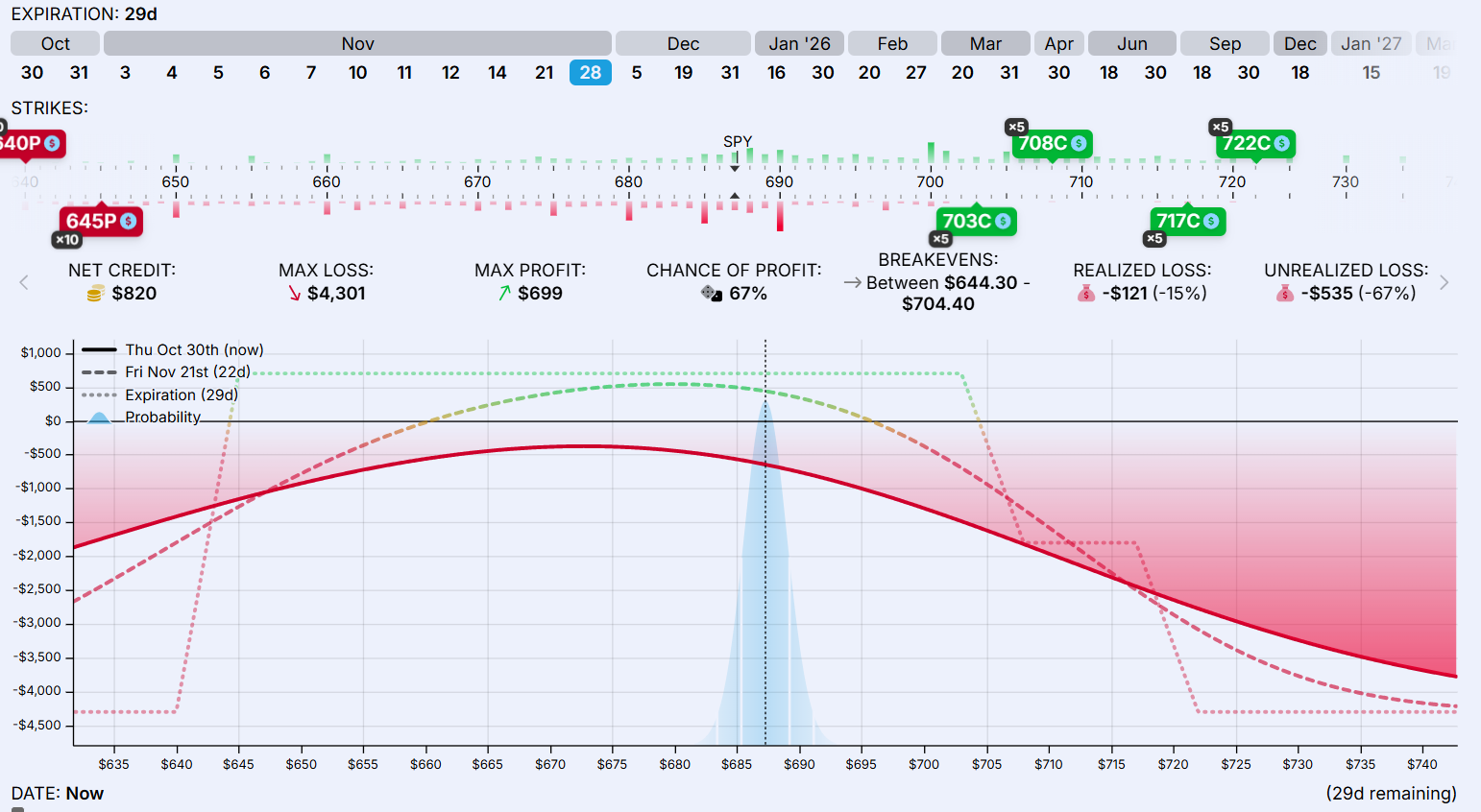 La BWB + BCS ha estado renqueante desde el inicio, en un escenario no muy benigno para este tipo de combinaciones. Siempre se puede ir ajustando utilizando o recomprando los spreads como palancas. Lo último ha sido recomprar dos BCS y preparar la estructura para que el alza del SPY no nos afecte llegado al vencimiento y salgamos empate, si nada cambia o seguimos hacia arriba. Todavía podríamos hacer algo de dinero si el SPY baja de manera ordenada en los próximos días hasta el rango de $655/$670, aunque como siempre ocurre en estas cosas, no nos vale tampoco cualquier tipo de bajada, sino una que combine precio con el paso del tiempo.