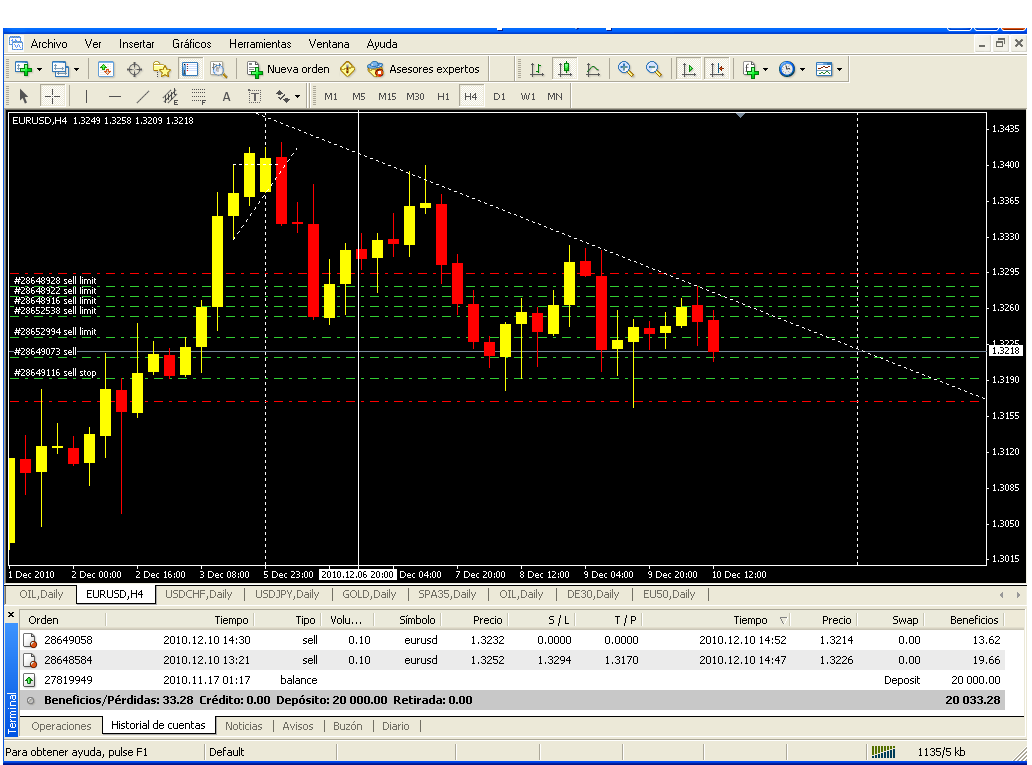 Está claro que el resultado tiene que ver con la fiabilidad, que ya lo hemos comentado por aquí...pero la cuestión es que, como ya dije, si tienes la certeza de que la fiabilidad va a ser baja, lo que deberías hacer es entrar con los 0.40 en el punto donde tienes la última sell limit...y ganarías bastante más o bien arriesgarías menos, según los profits y stops, claro.