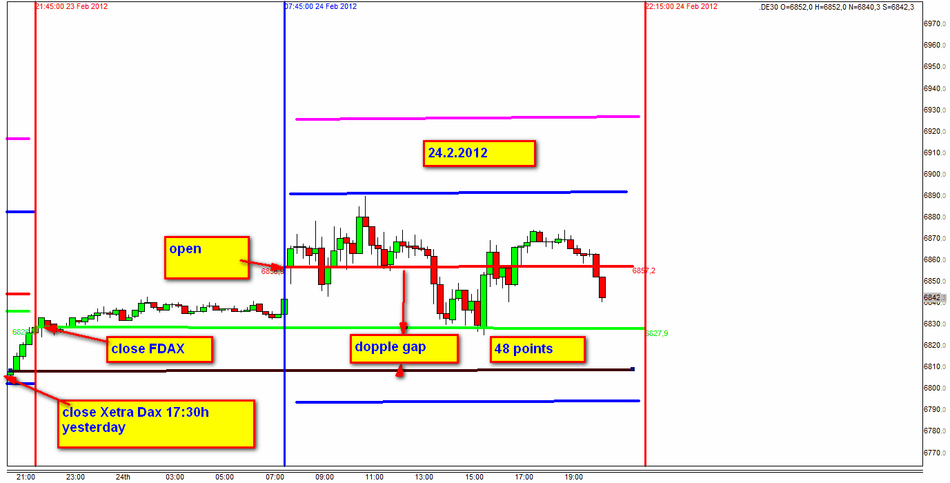 Un doble hueco se da si, p.ej., el FDAX se cotiza a las 22.00 h como mínimo 20 puntos por encima del precio de cierre del XETRA-DAX y tras la apertura del día siguiente, abre con un hueco en la misma dirección de 20 puntos +; es decir, en total, como mínimo +40 puntos. Entrada inmediata dirigida al cierre del hueco si los DJIA Fut no cotizan por encima de los +30 puntos. Si no, con las primeras velas de giro importantes, y verificación de si se