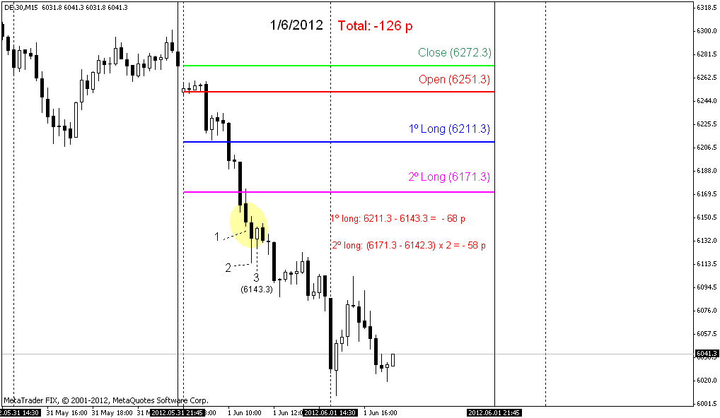 1. Se debería haber entrado en la primera zona con un contrato y en la segunda con dos. Y tras tres velas de 15 minutos cerrar la posición.