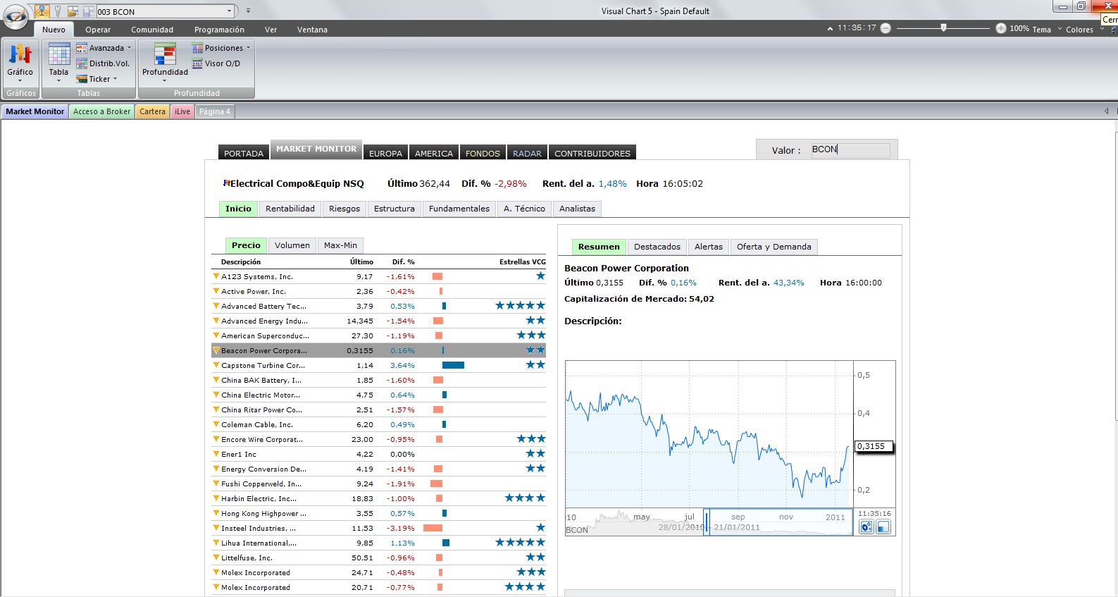 De estas formas es fácil buscarlo porque sabemos el nombre del valor. Lo que quiero yo es saber donde están las tablas o indices sectoriales donde están este tipo de valores. En el segundo caso donde hemos buscado el valor nos sale que pertenece al sectorial Electrical Comp&Equip Nsq. El problema está en que no encuentro está sectorial en el visualchart.
