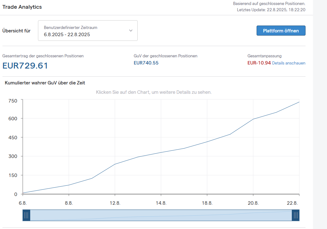 Así, de un capital inicial modesto, de ganancias mensuales aparentemente pequeñas y de la aplicación constante de Thinking Big y el interés compuesto surge algo extraordinario: un motor de libertad a largo plazo — y con mi estrategia de trading en el German 40 (DAX) este camino es realista y alcanzable.
