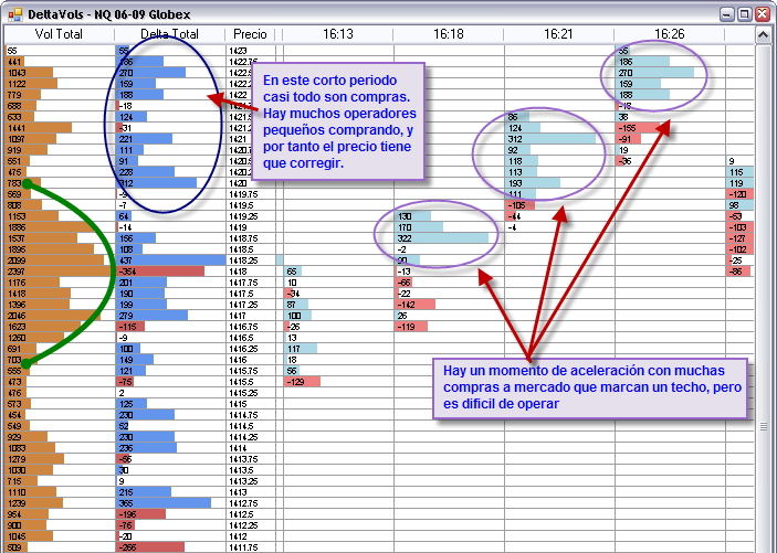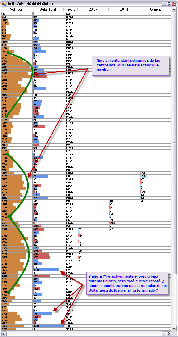 Total, que se me hace muy dificil interpretarlo correctamente. Sin embargo esta prueba tiene validez relativa: he usado el NQ porque estoy acostumbrado a él, pero mañana probaré el ES, que creo que es más apropiado para identificar claramente estos comportamientos. También probaré el Bund, porque no hace mucho vi que el Delta era mucho más claro con él.