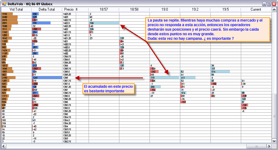 hay (relativamente) muchas más compras a mercado que se pueden ver tanto en los deltas de las barras como en el Delta global. ¿ qué pasa si los operadores pequeños se lanzan a comprar a mercado pero el precio no sube, o deja de subir ? pues significa que hay un tapón de limitadas a la venta, y el precio ha tocado un techo momentáneo. Efectivamente, el precio cae y no vuelve ya en toda la sesión.