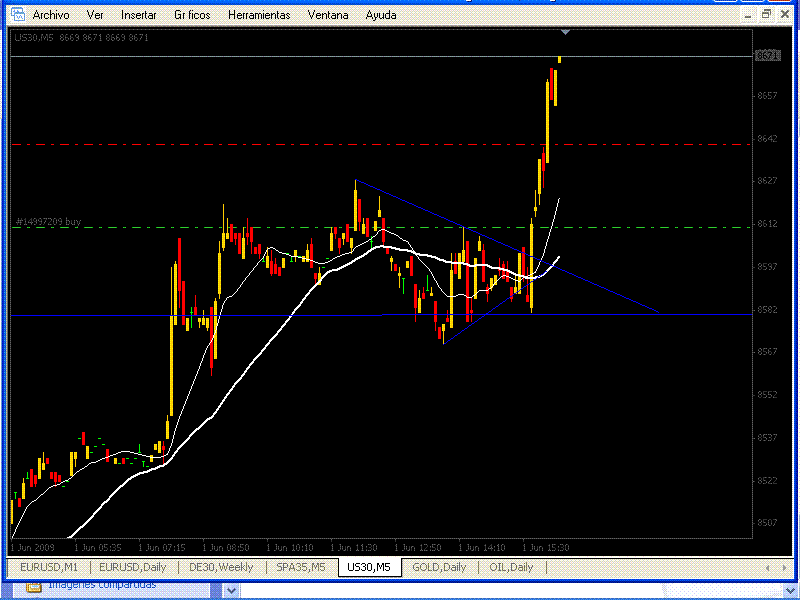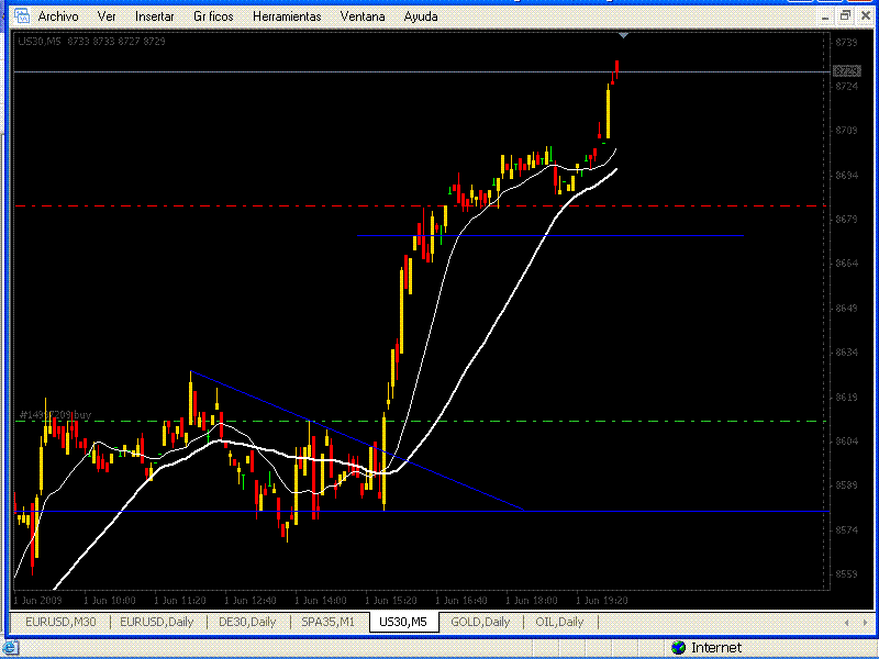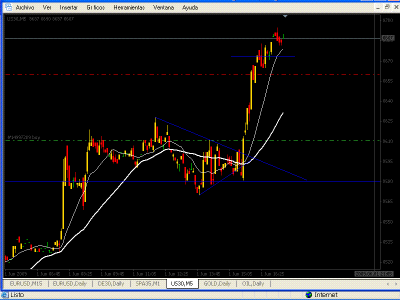 muy buena ganancia en la continuacion de la tendencia alcista del EURUSD....ademas, aunque todavia falta varias horas para que inicie la rueda del NYSE, TSX, BVL y viendo subir fuerte a los futuros del Dow Jones, ademas de la fuerte subida de los metales en el LME, es evidente que hoy dia sera una faena memorable si los datos del calendario economico referentes a Gasto Personal (abr) y al indice de precios de consumo personal (abr) que salen a que salen a las 14:30 gmt...si todo va bien, las bolsas pueden dar una buena trepada.... OJO con los ETF ultralong como DIG (Oil and Gas), UYM (Basic Materials), DDM (Dow 30), ERX (3x-energy), EDC (3x-mercados emergentes), e inclusive FAS (3x-financieras), muchos de estos ETFs me vienen dando EXCELENTES GANANCIAS!... Lo recomentdable para operar con estos ETFs es que hay que tener buen Money Management y buen conocimiento del trading, en general no es apto para novatos. Saludos.