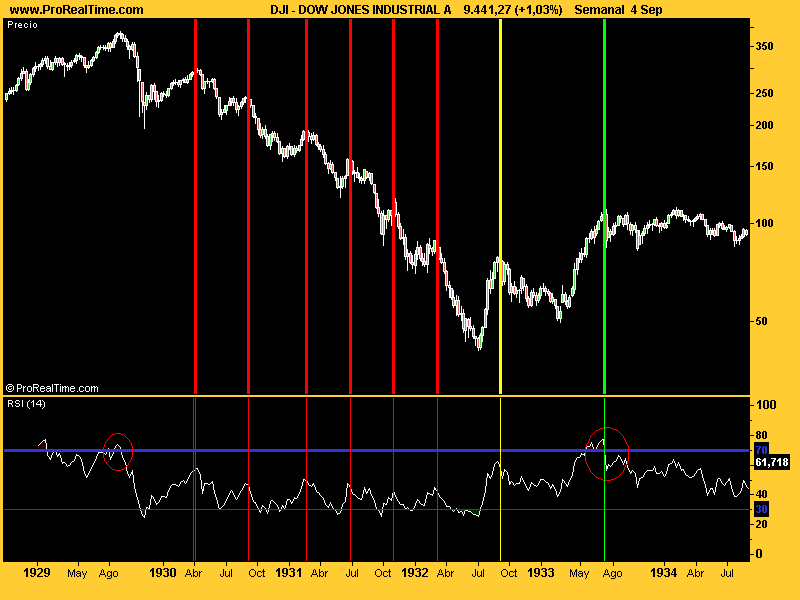 5.En 1933, el rsi alcanza por PRIMERA VEZ desde el techo una lectura de sobrecompra...la tendencia ha acabado y el movimiento en el que estamos es DE MAYOR GRADO que cualquiera de las recuperaciones anteriores. La sobrecompra del indicador de sentimiento sirve lo mismo que la sobrecompra del rsi.