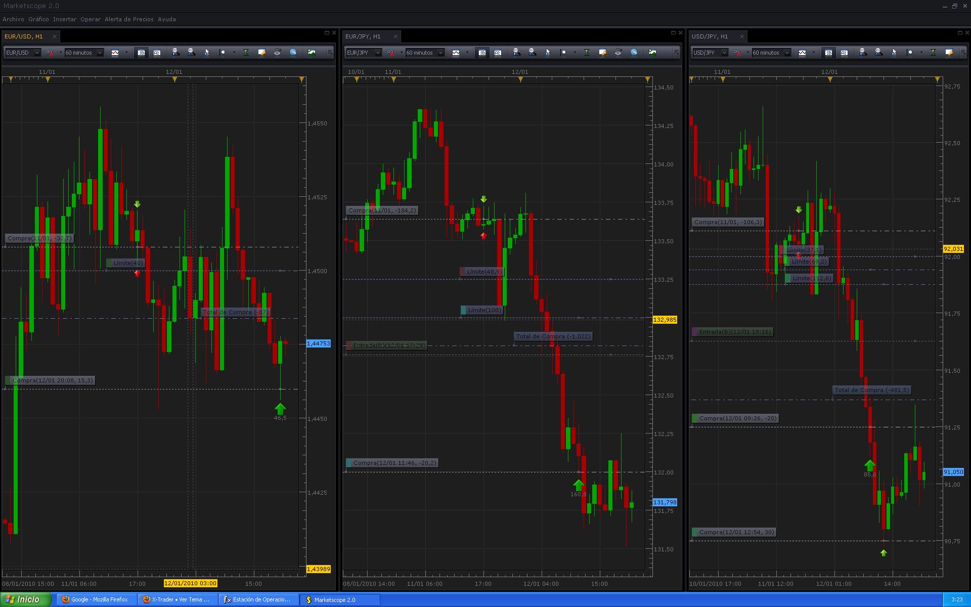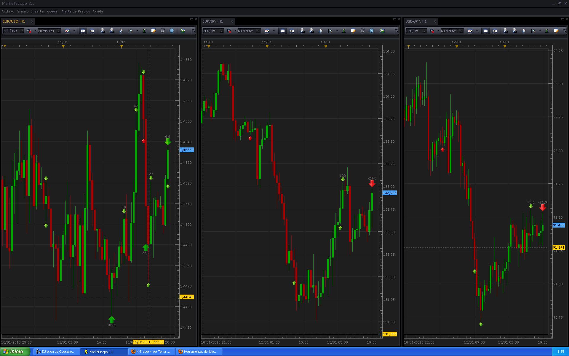 Pues nada, aqui dejo el ultimo post de este foro con las flechitas que señalan todas las ordenes que he ido abriendo y cerrando durante estos dos dias que la he mantenido, el que sabe interpretar la plataforma de este broker ya sabe que las flechas verdes son operaciones terminadas en positivo y las rojas en negativo, e incluso creo que pone los pipos ganados en cada operacion...