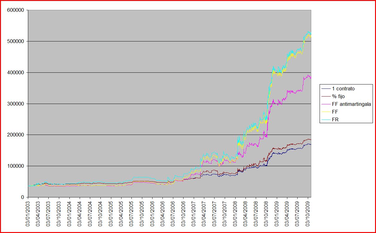 Estoy investigando varios sistemas, pero me gustaría aplicar "money management" para ver como se comportaría a lo largo del tiempo, si lo hubiése aplicado, y no con 1 contrato fijo tal y como acostumbran a ser las pruebas de una estrategia standar.