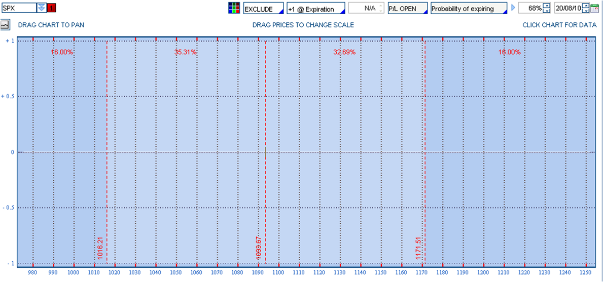 Thinkorswim tiene una herramienta muy buena para ver la desviación estándar en función de los días (a mayores días, el rango es mayor). Por ejemplo, para el SPX, en las condiciones actuales de volatilidad, la desviación sigma 1 (68% probabilidades) es que el precio acabe en la expiración de Agosto entre 1016 y 1171
