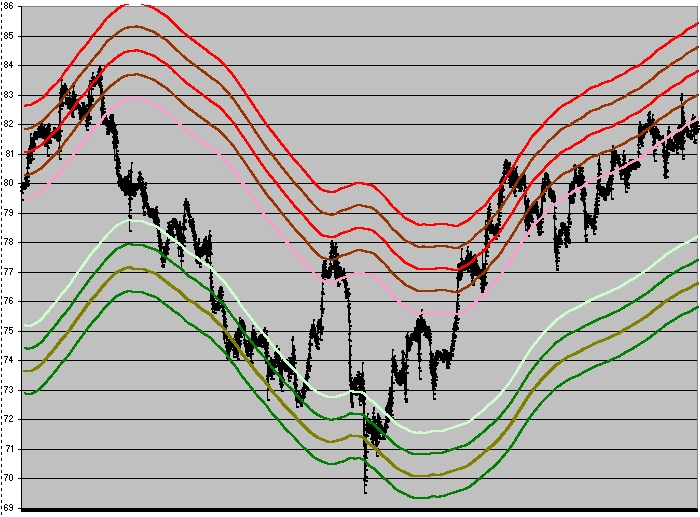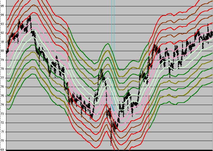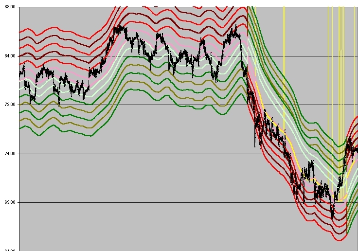 Es más fácil centrarse en un sólo espacio e implementar varias desviaciones standarts(y darles funcionalidad), pero aquí viene un problema, si la desviación standart es muy lejana, vamos listos y si es muy cercana tambíen, con lo que volvemos a los híbridos de adaptación, (en mi caso es desviación standart de 10 barras x 4 desviaciones , en base, para luego aplicarles dos medias exponenciales de 200 y 400 periodos, a estas se le aplican desvios por arriba y por abajo como muestra el gráfico que adjunto. Y por ultimo para que no se solape el híbrido de medias de 200 y 400 un corrector de distancia %. Asi siempre las tienes actualizadas.