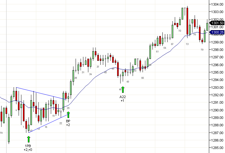 Un primer intento puede tomarse si la vela de señal está muy bien formada, como una vela de reversa en un sobretiro. Y si no, es muy posible que un primer intento mal formado te toque el stop. Un vistazo rápido a la acción de este día ilustrará la importancia de tomar solamente velas de señal bien formadas. Los cortos debajo de las velas 16, 20, 24 y 27, todos fallaron porque eran esencialmente dojis. Los cortos debajo de las velas 31, 46 y 63 resultaron mucho mejores, ya que eran velas de tendencia. Velas de menor calidad son tolerables durante la primera hora y en segundos intentos, como se ilustra con las velas 14 y 73.