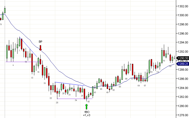 El movimiento temprano hasta el HOD (máximo del día) fue débil con velas solapadas y fue esencialmente una prueba del máximo del día anterior. Una vez que falló, el precio cayó a probar el mínimo del rango de trading. Un rompimiento debajo del LOD (mínimo del día) se mantuvo pro dos velas más, lo que era buena señal de que una operación de BP (retracción de rompimiento) se prepararía, y se desarrolló en la vela 46.