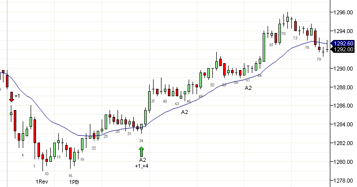 Una operación de DP (retracción de doble fondo o doble tope), que es por naturaleza una operación de alta probabilidad se desarrolló en la vela 63 seguida de una A2 en las velas 72 y 73. Observa que cada señal de corto decente desde la vela 16 tuvo éxito, por lo que la A2 era ciertamente candidata a una operación de swing.