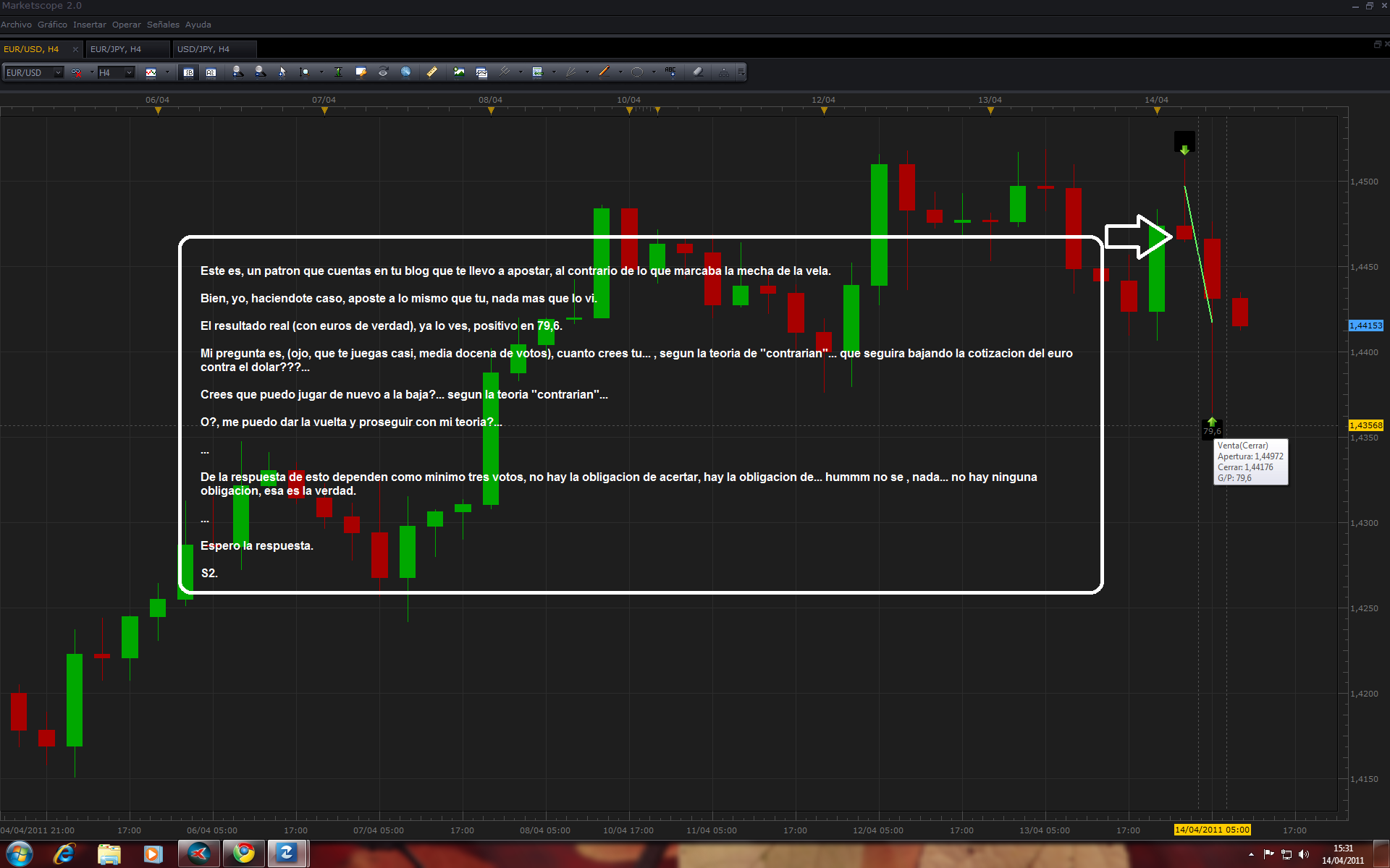 X-Trader escribió:Ja ja ja Blemish, bienvenido al Foro. Lo más gracioso es que, aparte de compartir visión del mercado (por un momento creí estar leyendo a Bill-T cuando leí tu reflexión en el Máster), compartís comunidad autónoma de residencia. Quién sabe, incluso puede que vivais al lado y no lo sepais