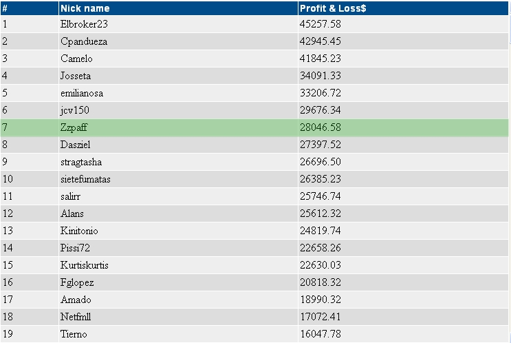 Yo voy octavo como puedo ir el ultimo, estoy usando la cuenta apra poner a punto el grupo de trading virtual del concurso, que sera para la segunda ronda, aunque en esta al final os daremos acceso para que podais ver el modulo estadistico y fisgar la operativa de todos los participantes, que es de lo que se tgrata, de promocionar Rankia, Strategy runner del que somos distribuidor para España y los VTG de Traderprofesional