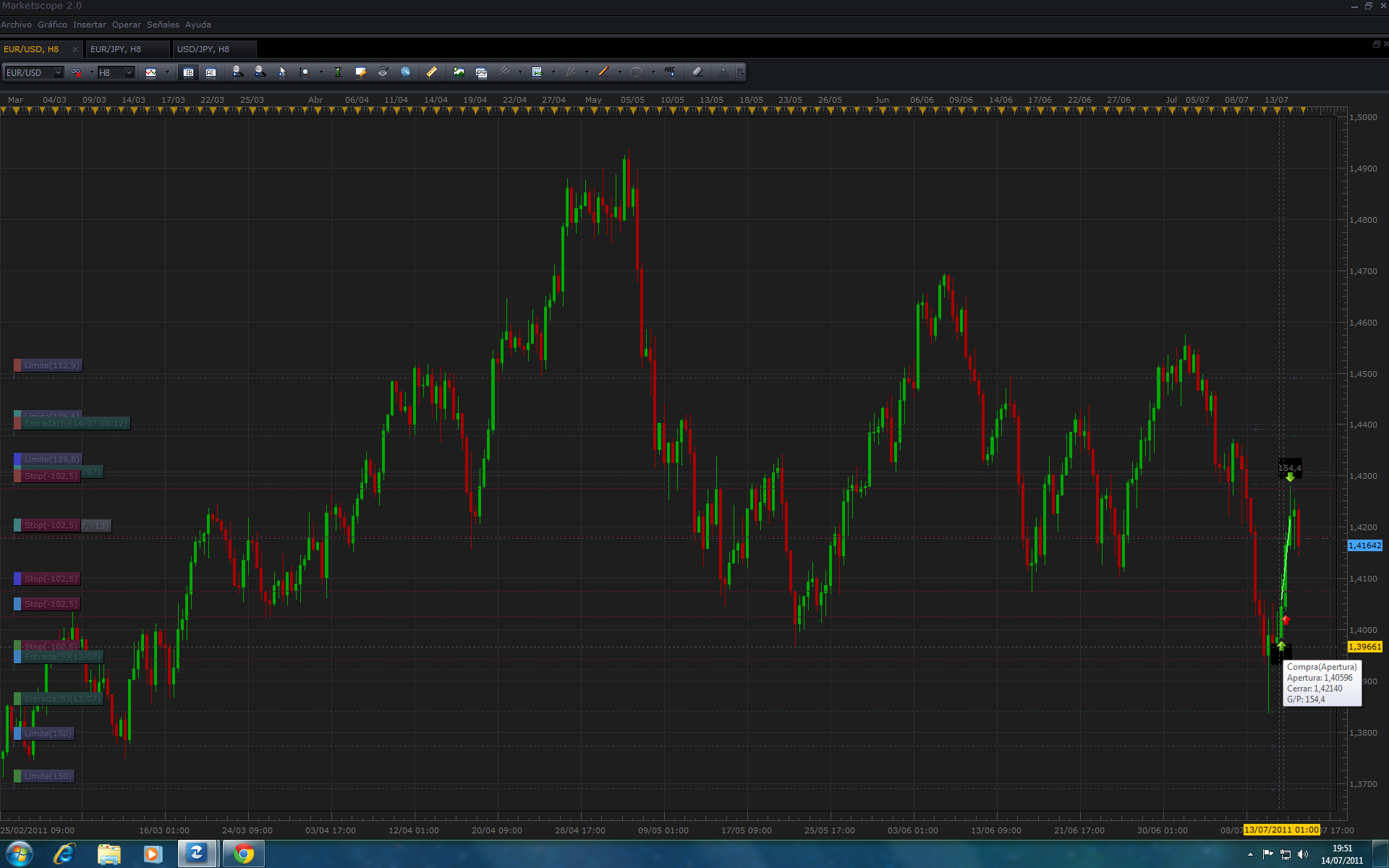 P.D. Los soportes semanales del Weekly pivot point ese que hay por ahí del metatrader son muy buenos como puntos de referencia: el S1 de esta semana estaba en el 1.4232...el mínimo de hoy: 1.4220. Y no es casualidad. Con esa referencia te hubiera salido redondo el asunto...