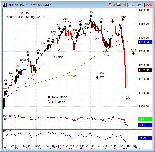 Veo una cosa curiosa: los parámetros de MACD y del RSI son exclusivamente numeros de Fibonacci. Pero no veo que tenga que ver los números de Fibonacci con los ciclos lunares. Por coherencia, el RSI no debería ser 13 sino aproximadamente 11 según la teoría de ciclos (ya que la mitad de mes lunar son 10,55 dias de bolsa, = 29,53 / 2 * 5 / 7).