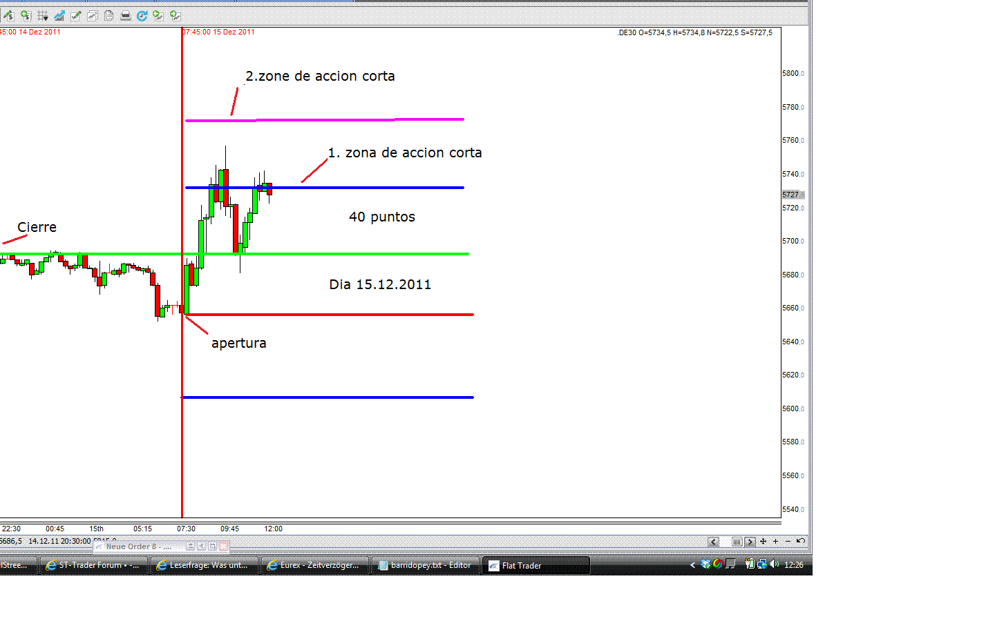 En primer lugar te comunico que tu grafica no es correcta. Las zonas actuales cortas se basan hoy en el cierre de ayer del DE30 ( 5692). La primera zona corta se situa a 5732 y la secunda a 5672 que no ha sido alcanzada. Ten en cuenta que el FDAX vence manana y la diferencia con el DE30 actual es muy poca.