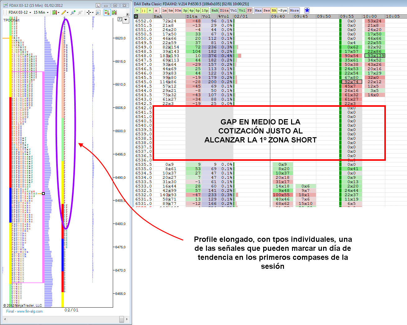 A las 9:45 cuando el precio llega a la primera zona short en el FDAX, el FDJI cotizaba a +45 puntos de la apertura, casi a los 50 puntos que puede marcar un día de tendencia, en esa misma hora el VDAX NEW caía con fuerza, incluso marcando divergencia en los primeros 15 minutos con el FDAX, anticipando los primeros movimientos al alza y el cierre del gap. Al mismo tiempo durante la media anterior el precio cotiza entre la 2ª y la 3ª desviación típica y por encima del ATR. El profile presentaba una forma elongada con tpos individuales y con escaso volumen que se podía comprobar en el Order Flow donde se producía un gap alcista en medio de la cotización, llegando a producir divergencias deltas, es decir deltas negativos con subidas del precio. Todo ello hizo que me quedara quieto en la primera zona de posible corto.
