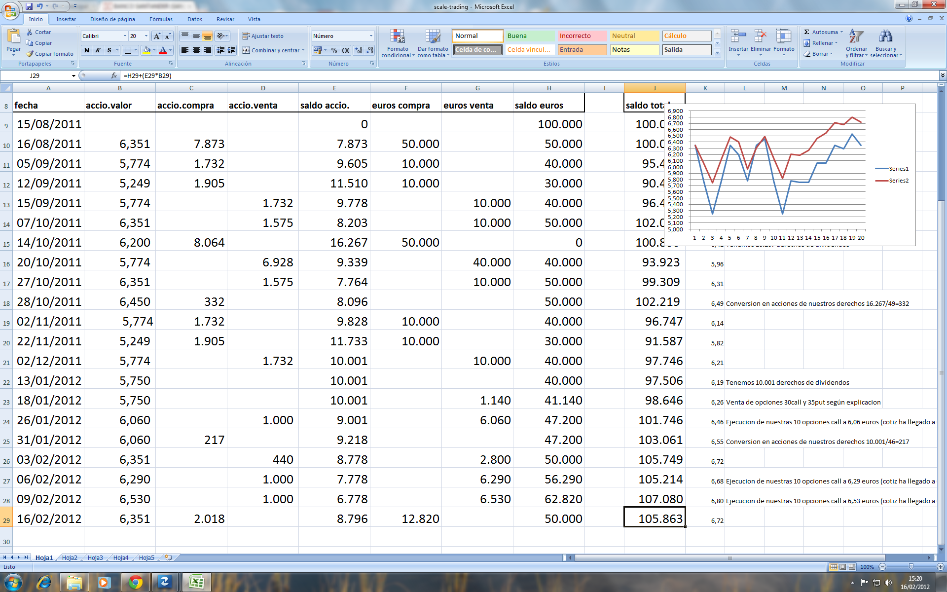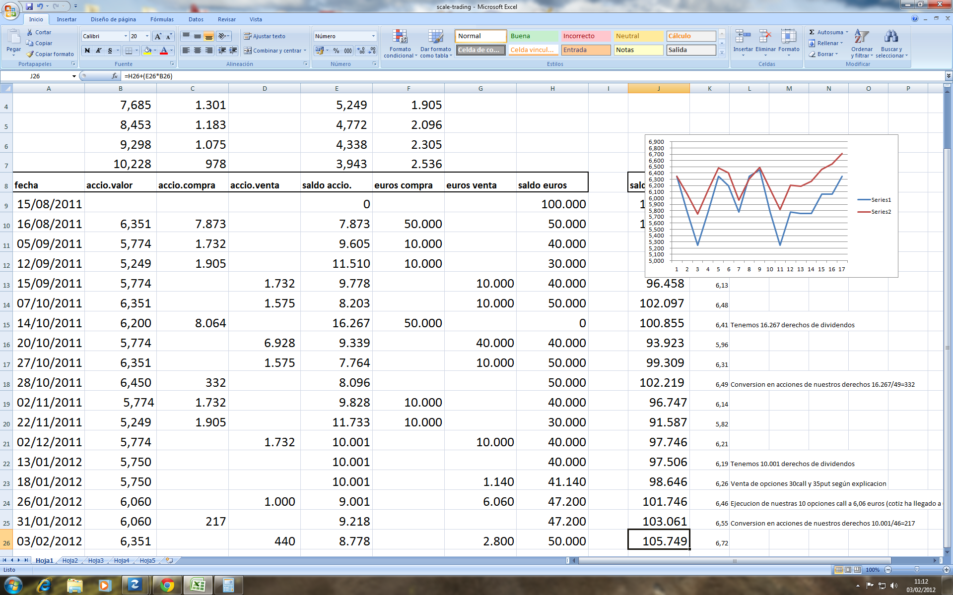 La teorizacion si que es mas sencilla, pero ya tengo pensado lo que hare, cuando me venzan las opciones de marzo, modificare los valores de la escala, y los ajustare a los valores de las opciones... asi me coincidiran tanto las escalas como las opciones que venda...