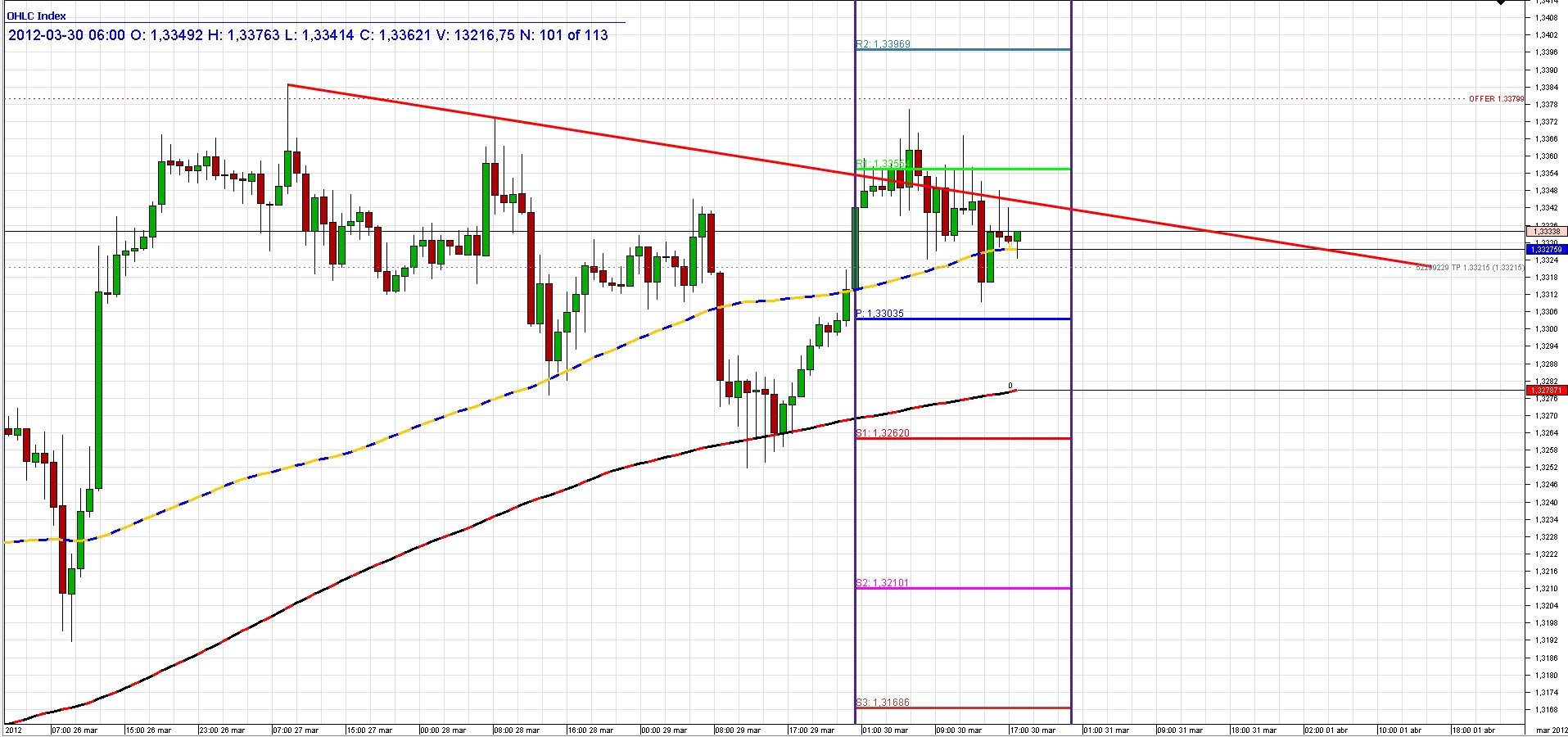 Al par lo voy a esperar para entrar corto en el 1.33799 y lo cerraría en el 1.33215. Una lástima porque hoy por 3,6 pips no se activó uno de mis 3 comercios a las 06:00 GMT pues ya lo hubiese cerrado (mirar el adjunto), pues se cumplieron todas mis conjeturas y lo comenté ayer cuando el par estaba en 1.3250 y preveía como los institucionales iban a barrer los stops de todas o de algunas de las zonas comentadas en el post anterior. Sigo sosteniendo el par lo sigo viendo lateralizado, cuando quiebre el pivot mensual, semanal y el número redondo 1.32, va retornar a su tendencia bajista. Y cuando lo haga voy a ir al encuentro pacientemente para "saludarlo" recién en el 1.3130 y pedirle amablemente que me deje unos pips, si se niega lo voy atracar con una llave efectiva.