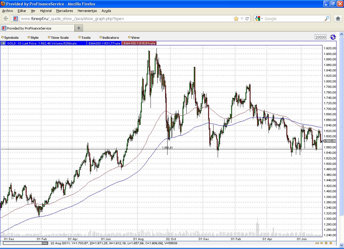 Como vemos en el semanal, los rebotes en los 1560 (línea discontinua negra)tienen cada vez menos fuerza, además después de romper a la baja el canal, la incertidumbre se ha apoderado del oro.
