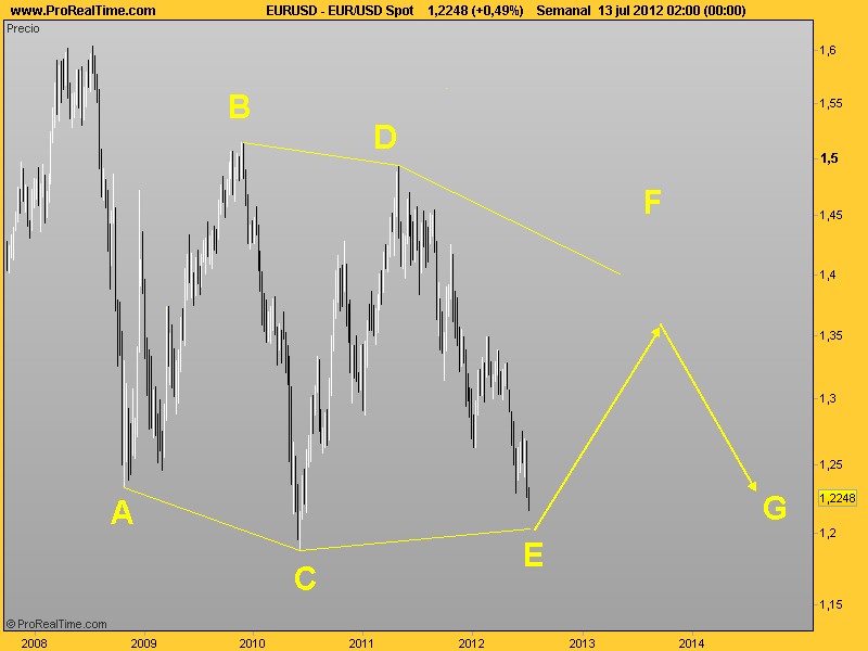Viendo el asunto en teoría debemos de estar cerca de su finalización. Después vendrían unos cuantos meses alcistas (F) y otros tantos meses bajistas(G) con lo que podemos decir que el movimiento estaría atrapado en rango 2 o 3 años...