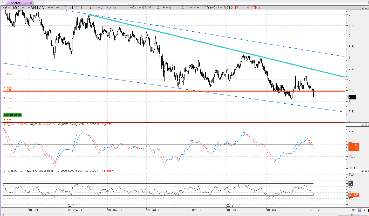 Con lo que un Santander alcista, lo podemos ver a partir de 2014, ya que esta depresión que vamos a entrar, (con las duras medidas que todavía faltan) va a hacer que el banco (ya no que gane o no de España, si eso da igual) tendrá que seguir haciendo grandiosas provisiones y ampliaciones de capital para su solvencia donde la cotización y el dividendo serán decapitados...y otra cosa importante tendrá activos poco líquidos como la deuda española que está ya prácticamente colapsada eso acelerará los trámites.