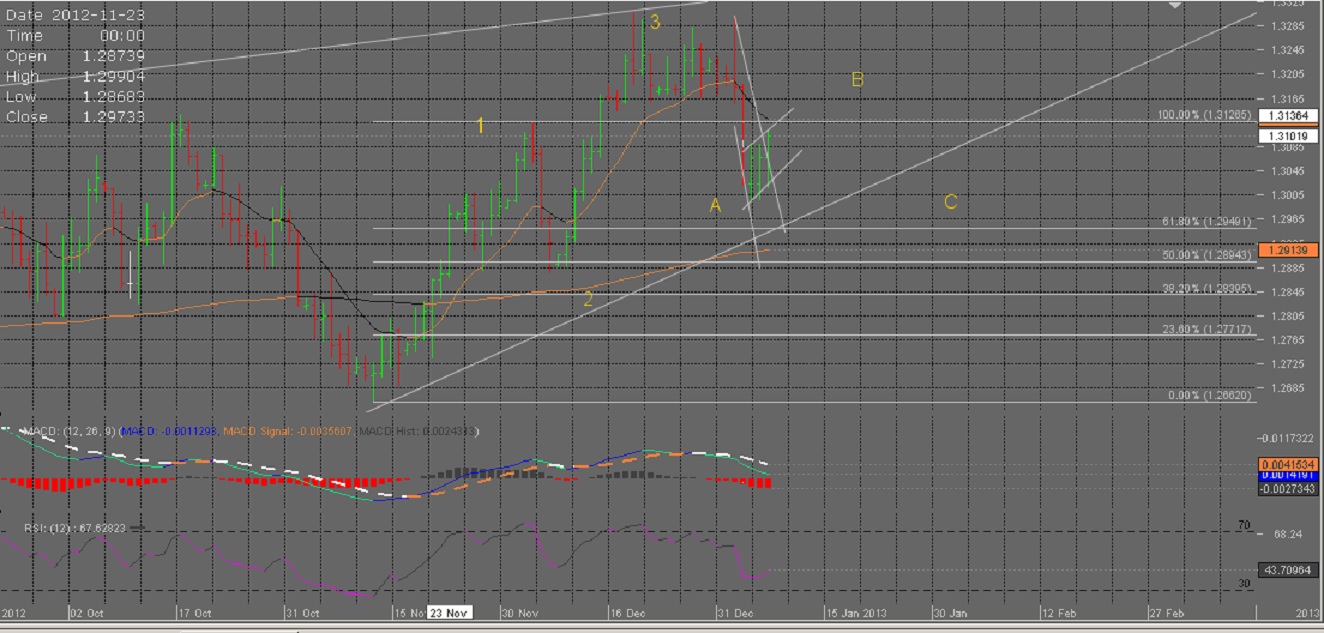 Está desarrollando una pauta parecida a la del 30-10-012 , de ser así ,continuaría subiendo hasta el 1.3180 aproximadamente para después bajar hasta el 1.2780.
