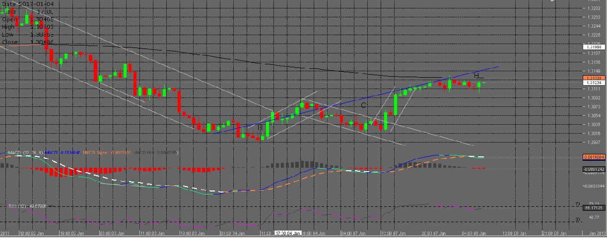 Es una figura que he dibujado para las próximas horas. Como podéis ver en el chart es un HCH, que si se confirmase, cerraría el último hombro entre las 4 y las 7 de esta tarde (hacia los 1,3175-80). El TF es 1H y si estoy en lo cierto rompería hacia arriba con un objetivo de unos 65 pips aprox. (en torno a los 1,3240).