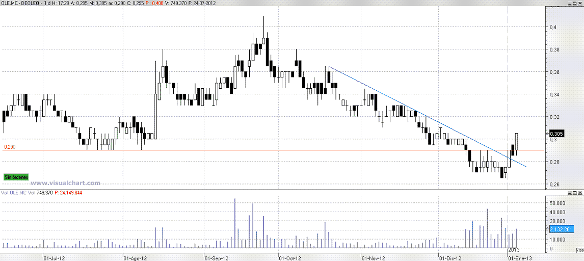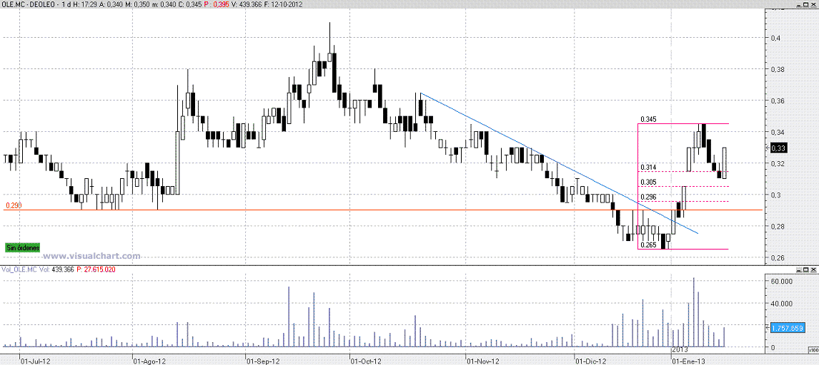 -- Deoleo. Ojo con este valor, que no es muy liquido. Ese volumen fuerte que se ve en la zona en la que se está moviendo, primero amagó hacia abajo, y luego ha recuperado con claridad. Si corta el 0,29 puede ser una acumulación profesional, pero yo esperaría después a ver el retroceso como es, si con oferta o con demanda. Valor para vigilar.
