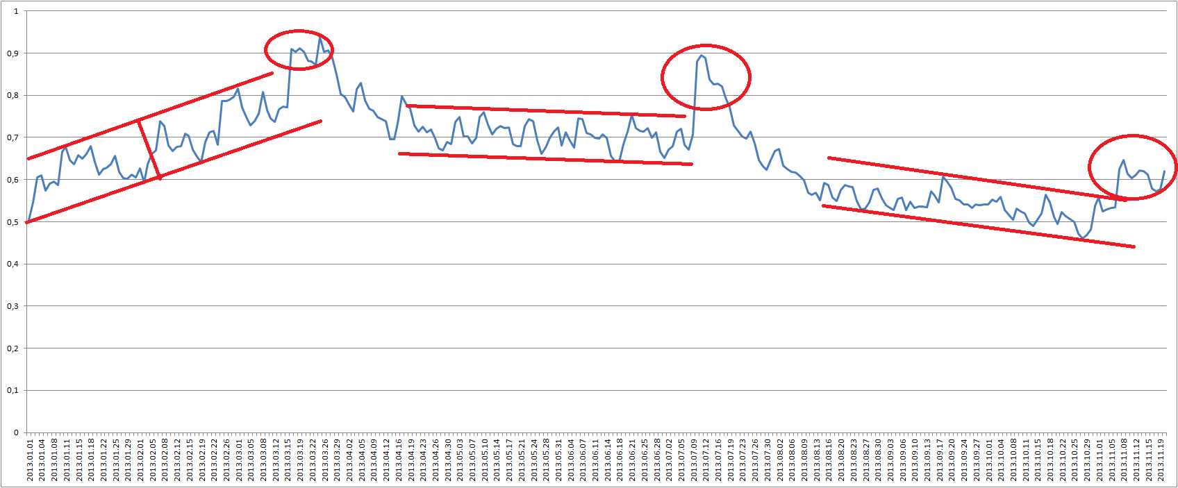 Lo concreto más: si lo que va a venir es un cisne negro, poca cosa podemos hacer. Pero si consiguiéramos un esquema que abarque fases "largas" como la de abarca todo 2012 y todo 2013 en un sólo paquete, algo que se adapte a esa escala de cambios, tal vez tendríamos algo consistente durante el suficiente tiempo como para operar un tiempo, cerrar, volver a empezar y poco a poco mantener una consistencia. No es lo mismo tener que adaptarse a un gran cambio brusco que poder navegar por varios cambios bruscos juntos.