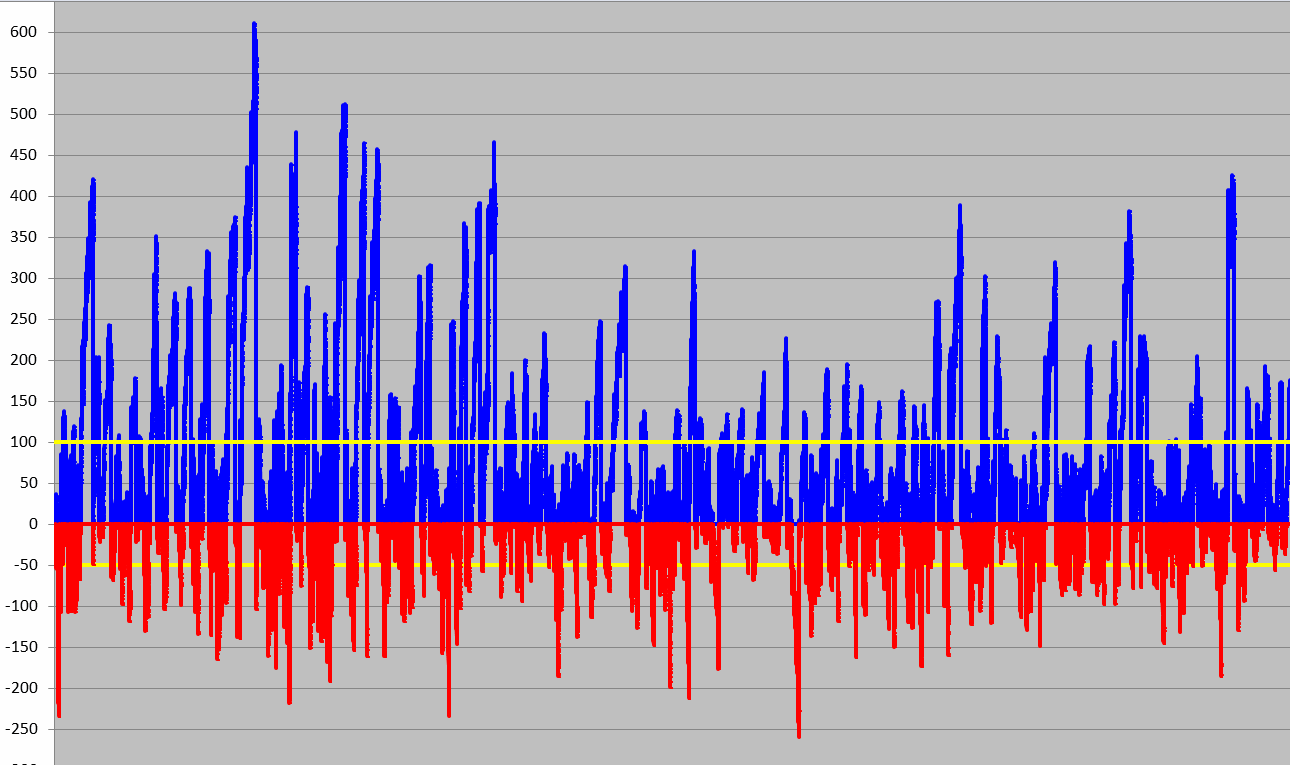 No sé si servirá un poco de visión, este gráfico del año 2000 a 2002 nos muestra los desvíos que tiene el dax en velocidad de tendencia, sesgado a la parte alcista del desvío, cuando vemos marcado zonas azul sin sobrepasar los 100 puntos, se puede considerar movimientos de reversión, pasados los 100 puntos de disparo alcista, es tendencia direccional fuerte. Como esta configurado para el lado alcista en el corto el disparo de velocidad va a razón de 50 puntos...