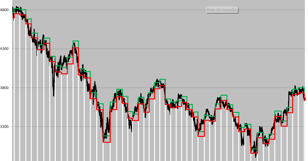 el problema es la direccionalidad y la volatilidad, te pongo un ejemplo, para hacerlo fácil, he cogido 6 meses donde el dax muestra direccionalidad y volatilidad, he optimizado los niveles a cada cierre y apertura, a la volatilidad por un coeficiente de rastreo, donde pone los niveles de reversión, si calculas los reverses son desorbitados, y aún así te chamuscan rápido.