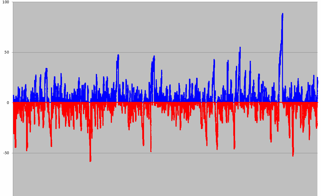No sé si servirá un poco de visión, este gráfico del año 2000 a 2002 nos muestra los desvíos que tiene el dax en velocidad de tendencia, sesgado a la parte alcista del desvío, cuando vemos marcado zonas azul sin sobrepasar los 100 puntos, se puede considerar movimientos de reversión, pasados los 100 puntos de disparo alcista, es tendencia direccional fuerte. Como esta configurado para el lado alcista en el corto el disparo de velocidad va a razón de 50 puntos...