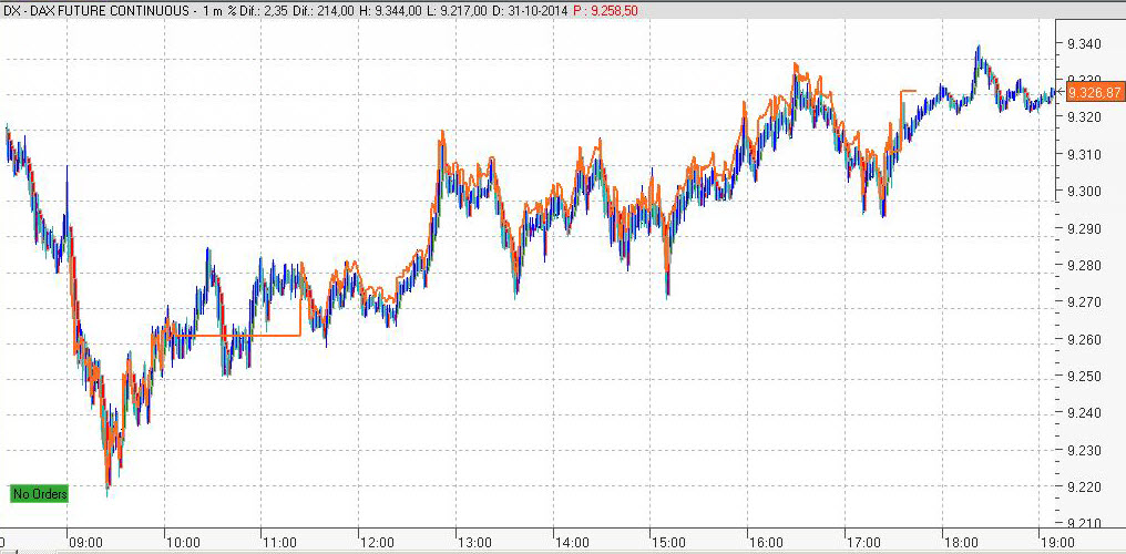 Está el FDAX en barras (lo azulito), y el DAX contado en naranja. De ahí, sacarías la hora exacta de negociación de cada uno. Haces lo mismo con los que quieras, y tirando.