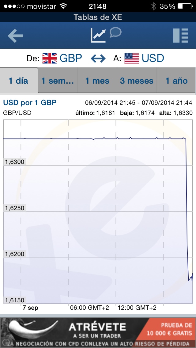 Atentos los traders de este par porque en preapertura viene con una caída de 150 pips, abrirá en torno a 1.6180, debido al avance de los independentistas de Escocia este fin de semana.