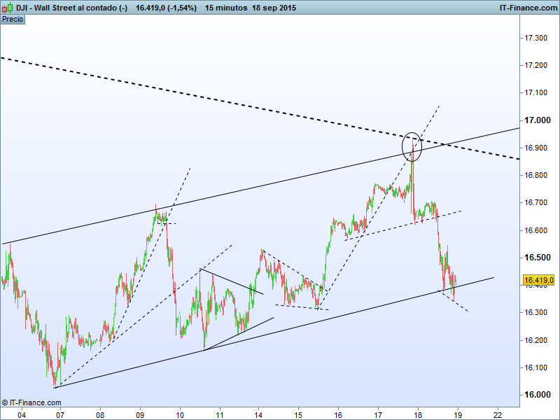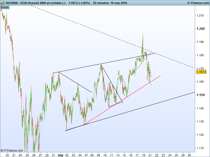 Las entradas buenas a cortos las marcaron en máximos el Ibex y los yanquis, ahora están en triangulo intradia y si les da por romper arriba una vez hayan madurado la decisión de la fed tendremos más de lo mismo dando bandazos hasta el ralli de fin de año, en esas fechas si lo preparas con tiempo con pocas operaciones el potencial es grande. Falta que metan un viaje para abajo y ahí hay que posicionarse mirando el cierre anual. El DJ está en la base del canal, el Nasdaq en 4 horas está en cuña con falso escape por arriba parando en la directriz y posterior rotura de la cuña por abajo. El SP500 rompió la base del canal pero sin muchas ganas .El Russell no tiene pinta de caer si no rompe el actual soporte. El stoxx 50 rompió la base del canal y está en triangulo. El dax se puede ver porque no subía como el resto. El ibex chicharron jeje ……..sin comentarios