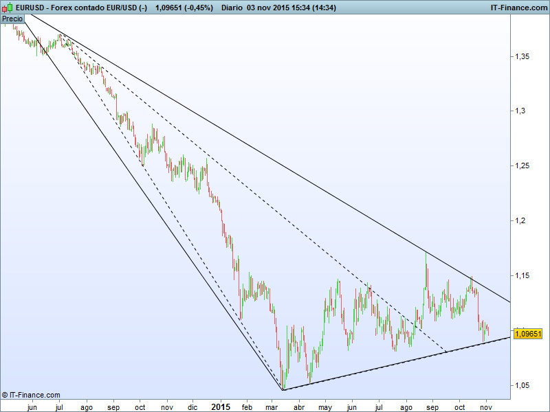 En el gráfico disrio EURUSD, podríamos dibujar varios triángulos como el tuyo que ya se han roto. Si el triángulo que ves se rompiera por arriba, ¿vamos a volver a dibujar otro triángulo aún más abierto para decir que el precio está dentro de un triángulo o vamos a empezar a reconocer -tras 8 meses de canal- que ya estamos en un canal alcista?