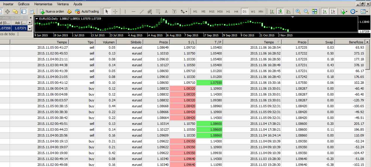 Habréis observado que las dos últmas órdenes del día 3 de Noviembre están sin numerar y van marcadas con dos asteriscos (**). La razón es que al parecer olvidé documentarlas aquí en el hilo, ya que estuve dos o tres días sin entrar a actualizarlo. Me he dado cuenta justamente mientras hacía los cálculos para escribir este post, no me cuadraban los números y he tenido que buscar a ver qué pasaba. Para no despertar suspicacias, os añado la captura de pantalla del "Historial de Cuentas" del MetaPajas. Que nadie crea cosas raras, de todas formas cualquiera que haya seguido el hilo se extrañaría de que no hubiera puesto ninguna orden ese día con ese gráfico...