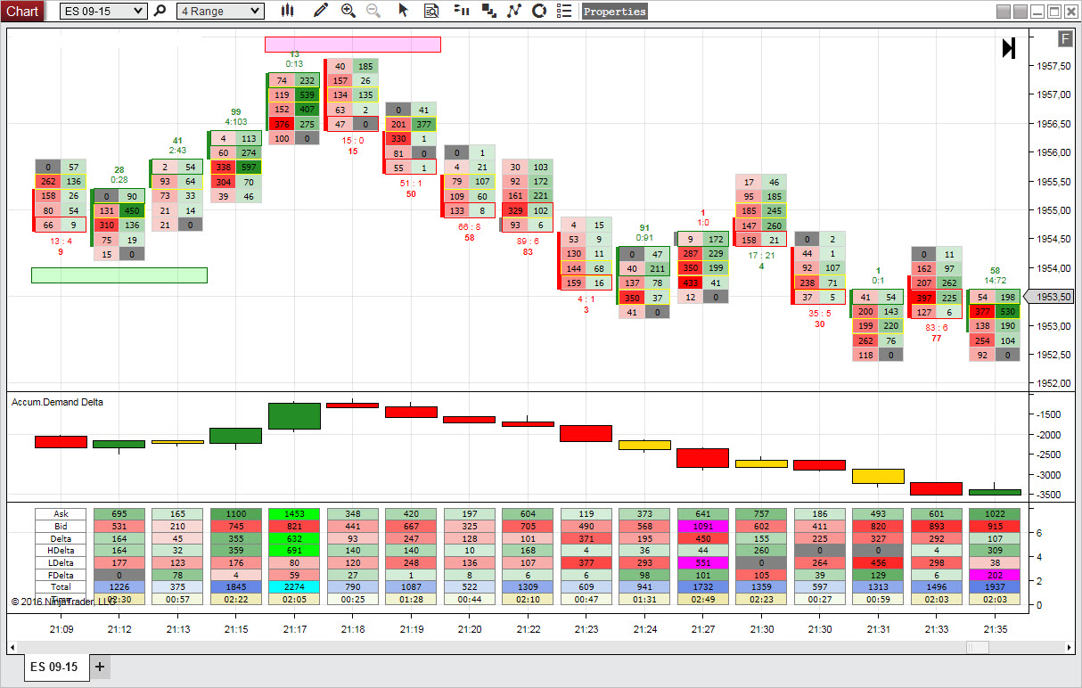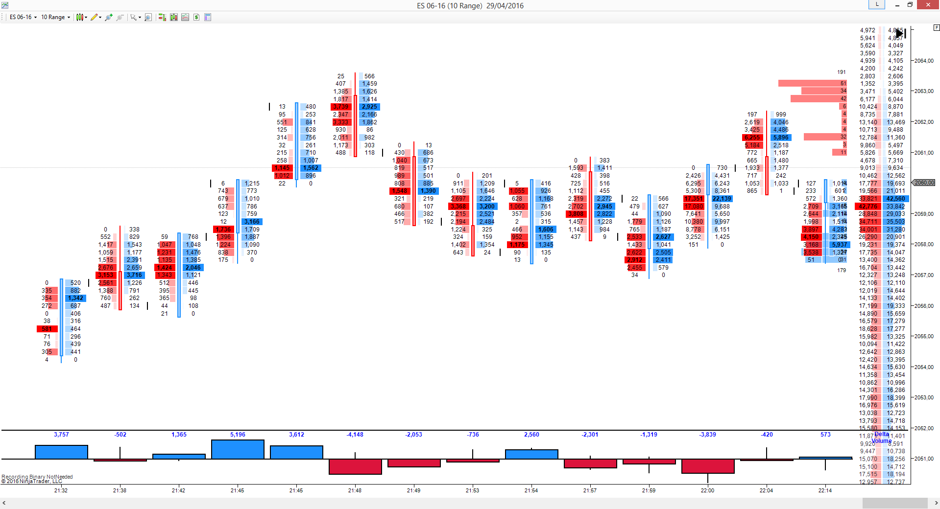 Así que las limitaciones vendrán por ahí. Particularmente uso Rithmic y no tengo esa limitación. Aquí una captura del mini-sp del 10-septiembre-2015 (es histórico, no market-replay, y son casi ocho meses de antiguedad de los datos).