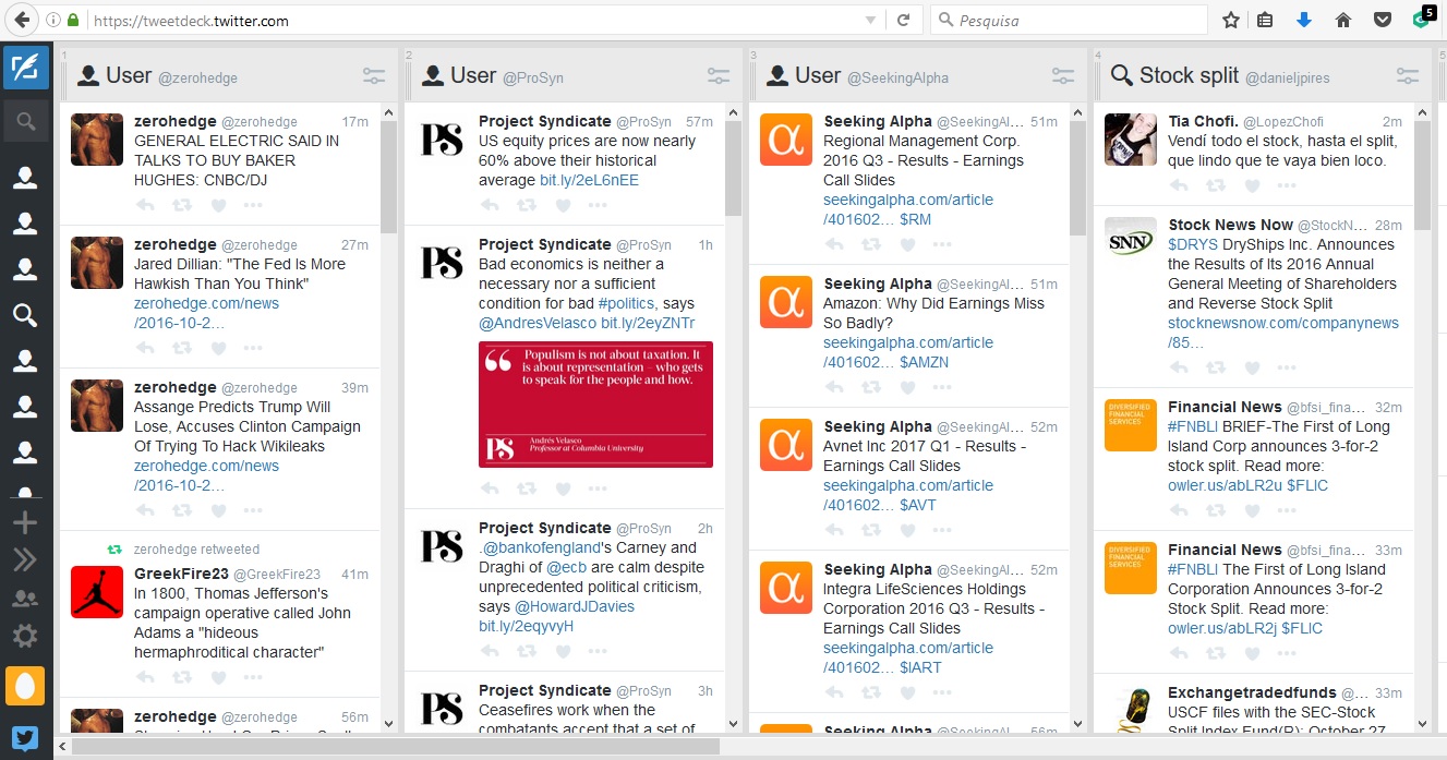 Una de mis plataformas favoritas de noticias de mercado es tweetdeck: https://tweetdeck.twitter.com/