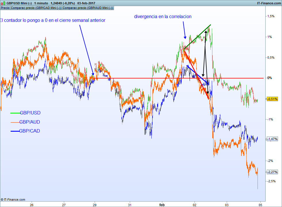 En este caso interesa observar una fuerte desviación a corto plazo que marque claramente la DIVERGENCIA EN LA CORRELACION