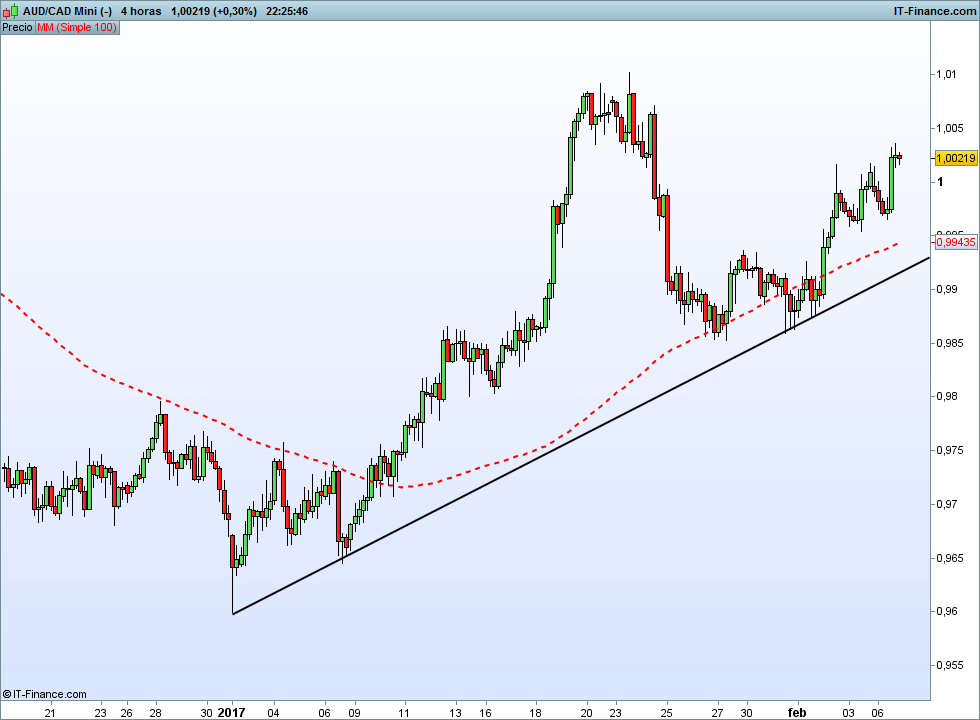 grafico AUD/CAD, están oscilando en la paridad con tendencia alcista , mas fuerte el australiano