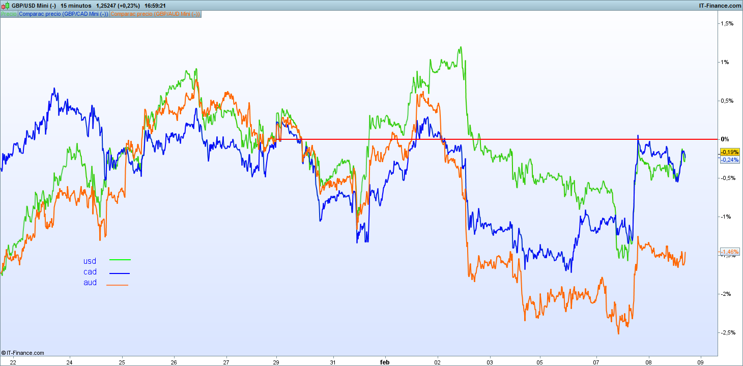 Estas graficas pueden dar lugar a malas interpretaciones porque el par mas fuerte sea el que mas caiga en la grafica donde se ven los tres cruces con la libra en las correlaciones, es normal que sea asi porque se esta apreciando el australiano frente a la libra y se esta apreciando mas que el americano y que el canadiense que también se aprecian contra la libra, la libra es el patito feo frente a las otras tres en este escenario