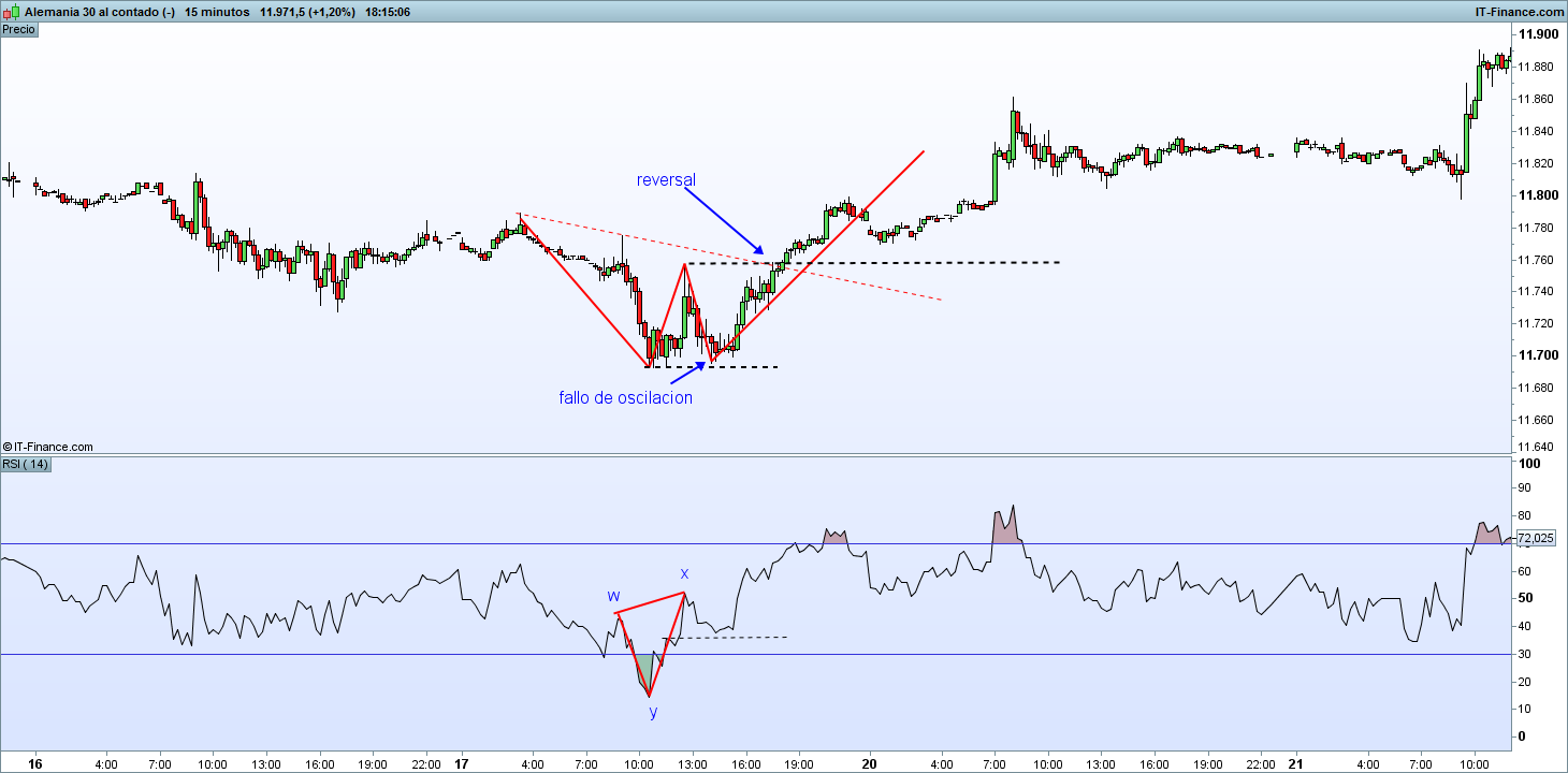 Te habrás confundido porque el Failure Swing ( FALLO DE OSCILACION) no es un patrón para detectar divergencias, es un patrón de estructura que se da el los giros con el RSI en zonas de sobrecompra-sobreventa