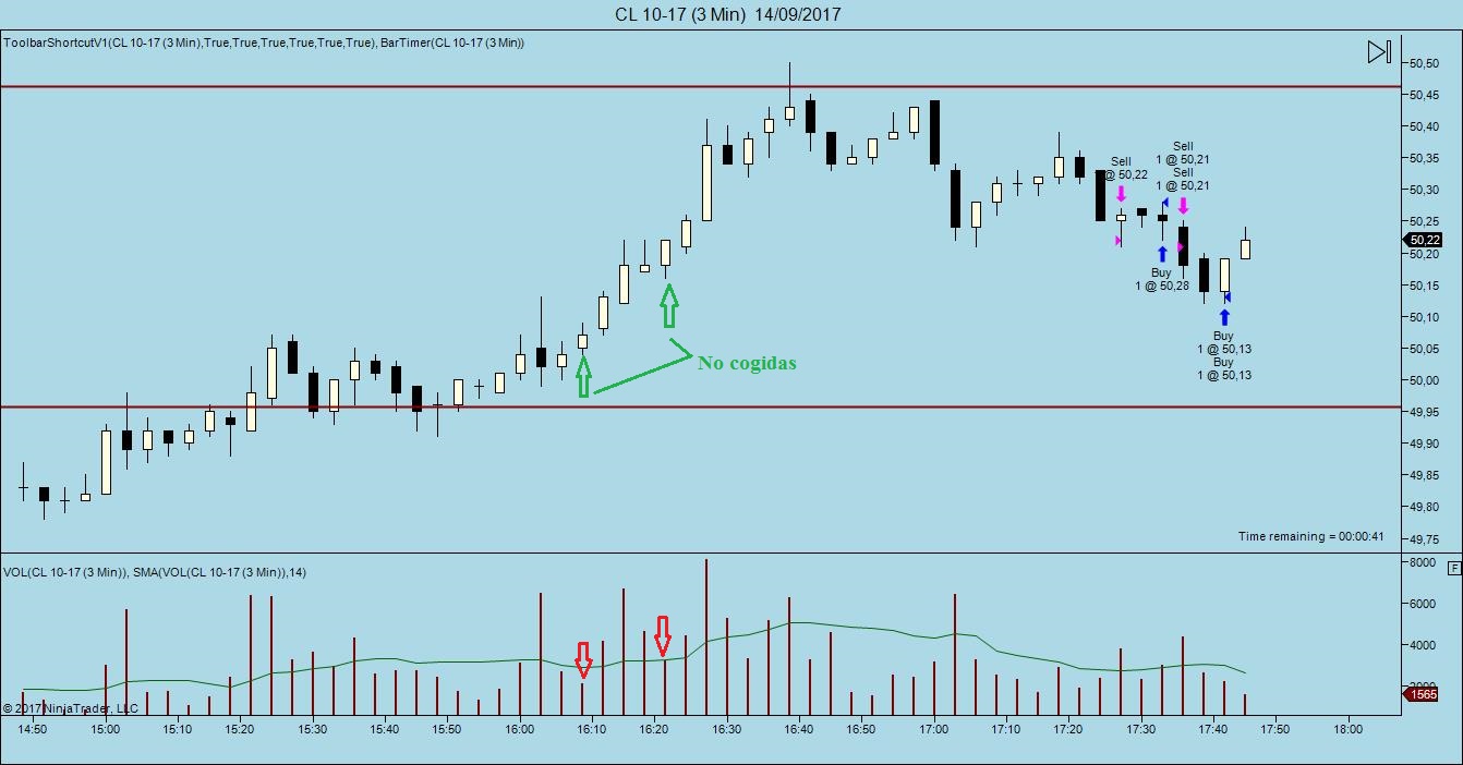 3. El segundo corto salió bien, pero con muy poco recorrido y además queriéndome "vengar" del mercado por el stop anterior, entre con dos contratos, cosa que mi cuenta no se puede permitir muy a menudo.