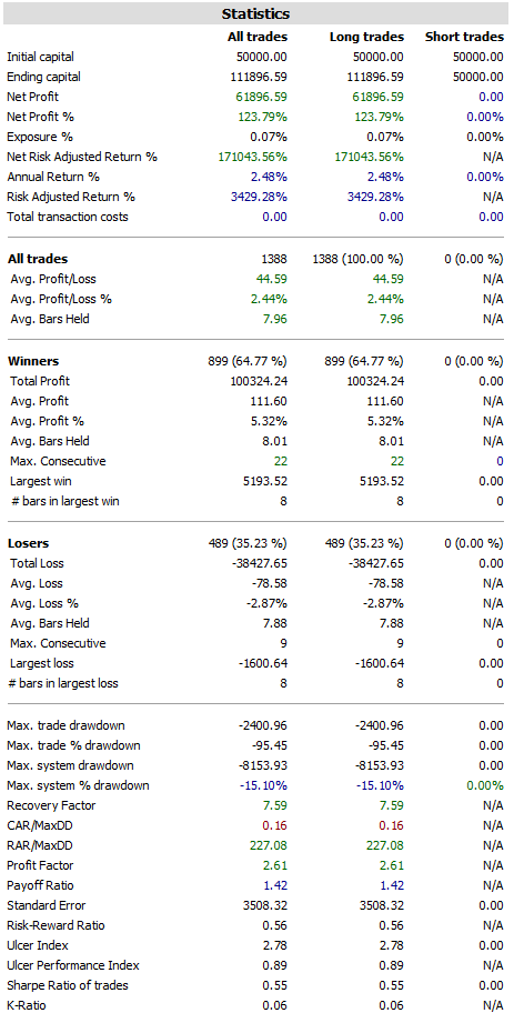 Aquí os dejo las estadísticas para Entrar el día 15 de diciembre y salir 10 días después, a pelo sin stops ni profitTarget con un máximo de 50 posiciones simultaneas. Bueno a ver si sacamos algo interesante, aunque sea para un ETF de la industria bancaria....