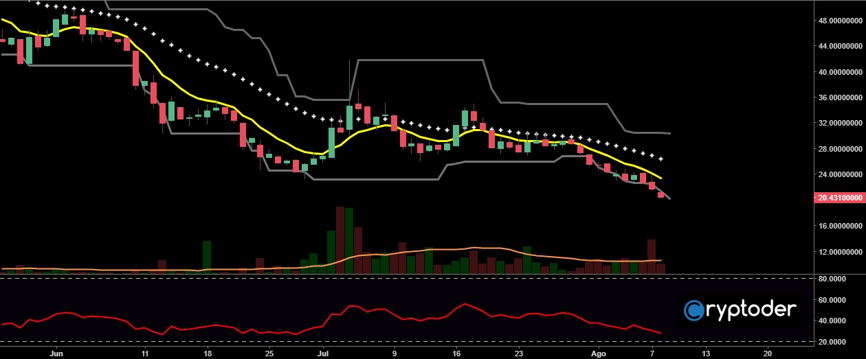 Inicia la sesión de negociación del miércoles bajo una tendencia bajista, el criptomercado en general reporta pérdidas encabezadas por Bitcoin el cual ha disminuido un 7% en las últimas 24 horas. NEO una criptomoneda reconocida por ganar altos porcentajes en sesiones alcistas está perdiendo un -8.87% llevando el precio a un nivel de negociación por debajo de los €21.